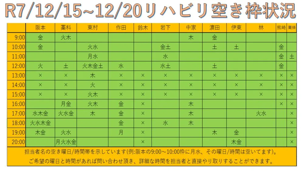 例えば、東村の19時台に「月金」とあれば、その時間帯と曜日の19:00・19:20・19:40いずれかに空き枠があるということになります。