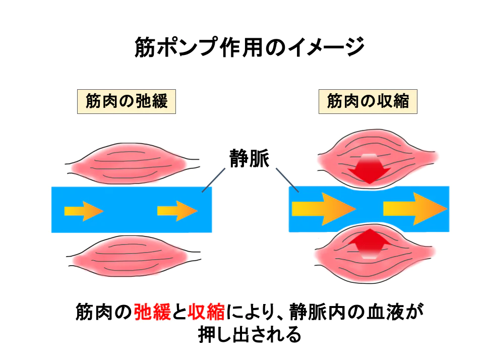 日中は歩いたり立ったりすることにより、足の筋肉が収縮と弛緩を繰り返し、静脈の血液を心臓に押し戻す『筋ポンプ作用』が働きます。