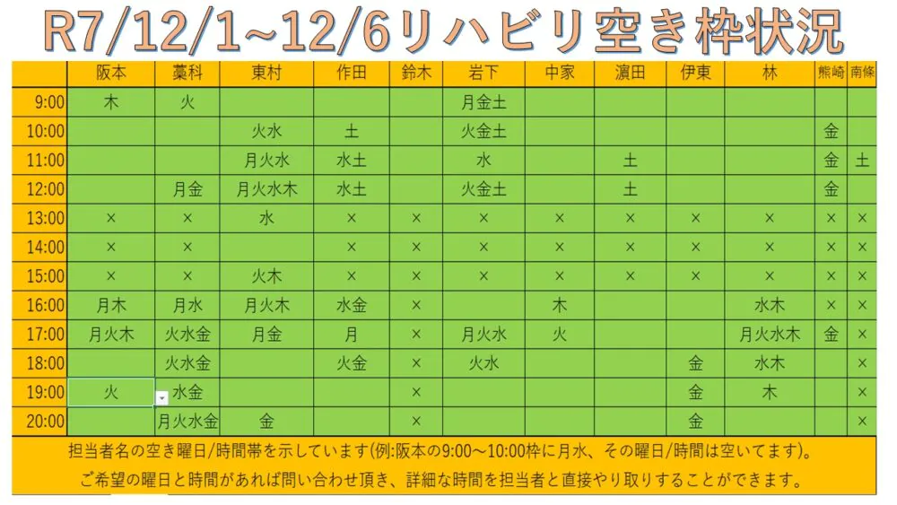 例えば、東村の19時台に「月金」とあれば、その時間帯と曜日の19:00・19:20・19:40いずれかに空き枠があるということになります。