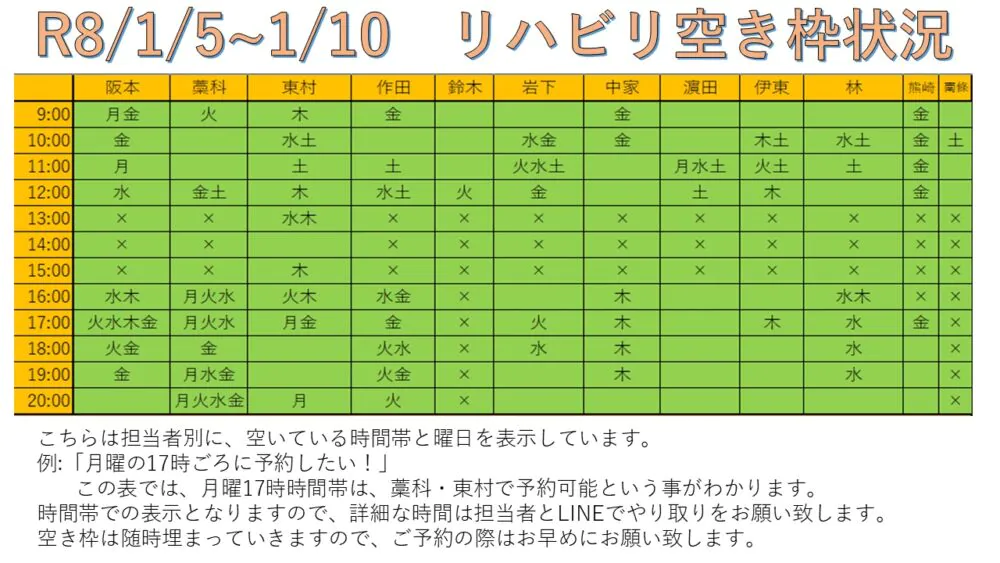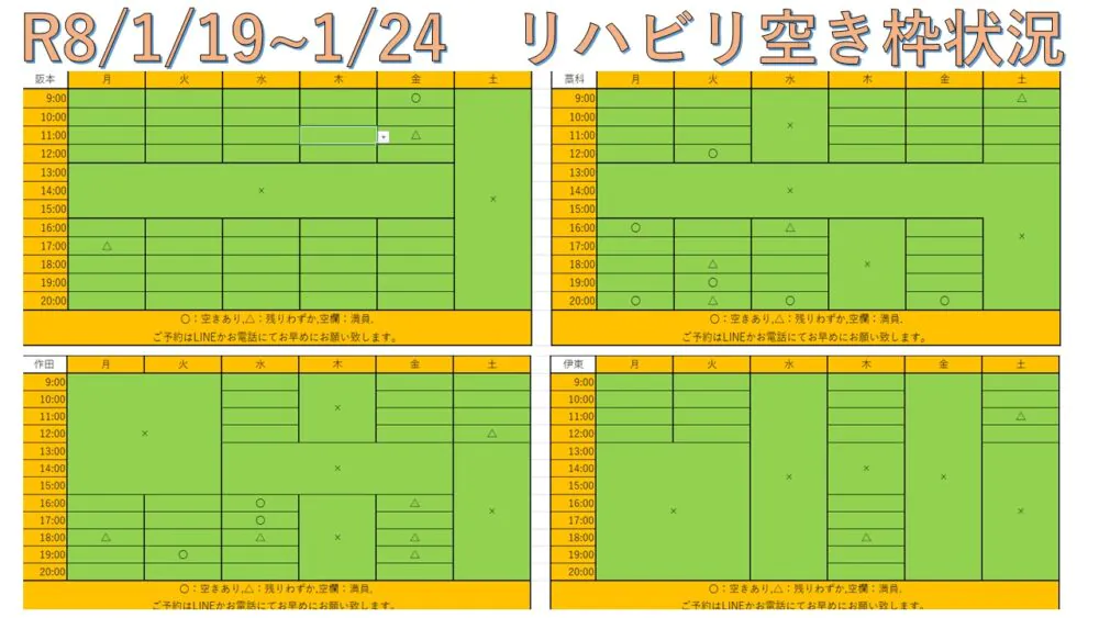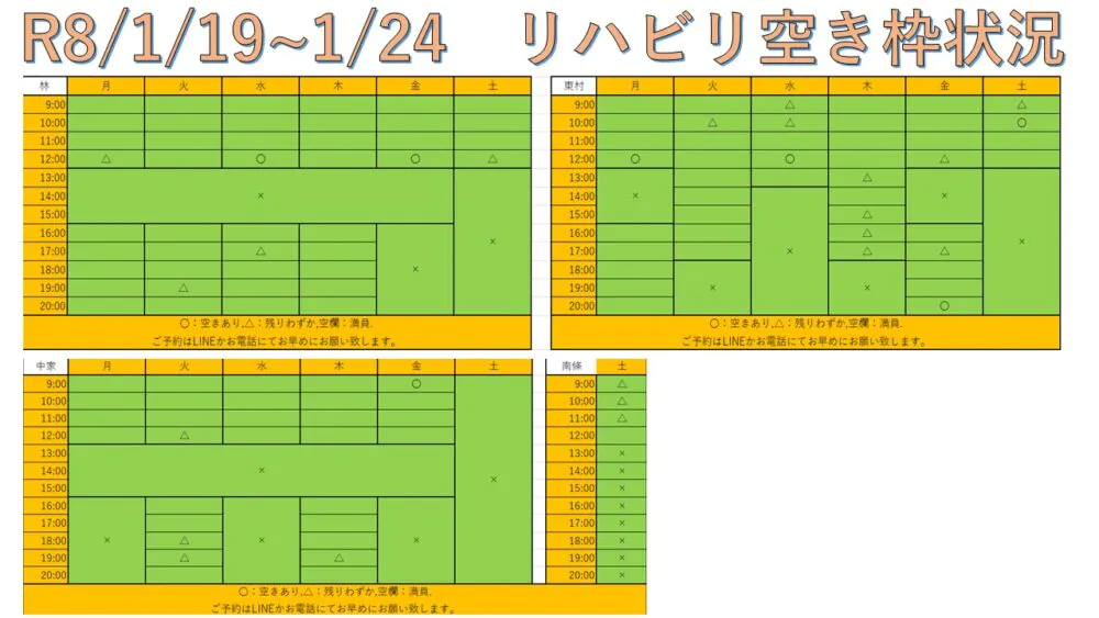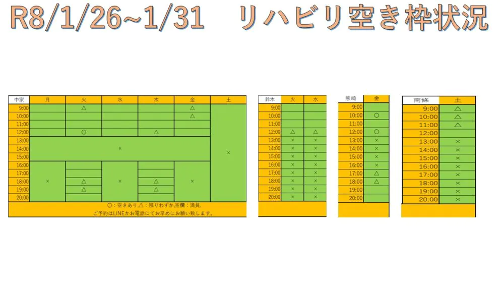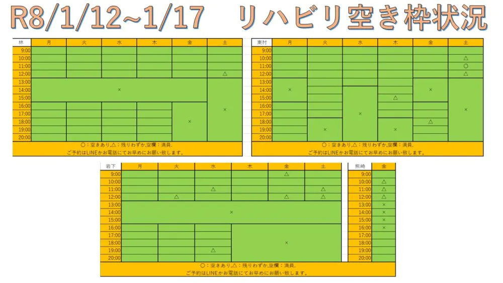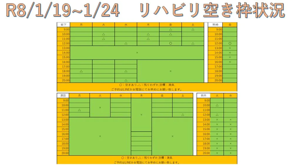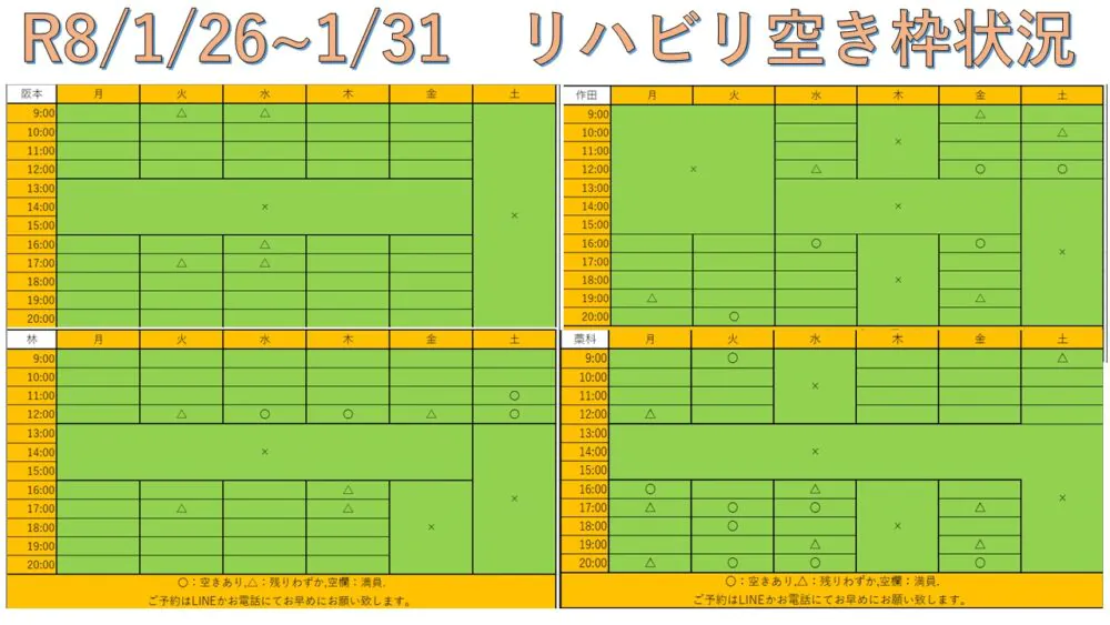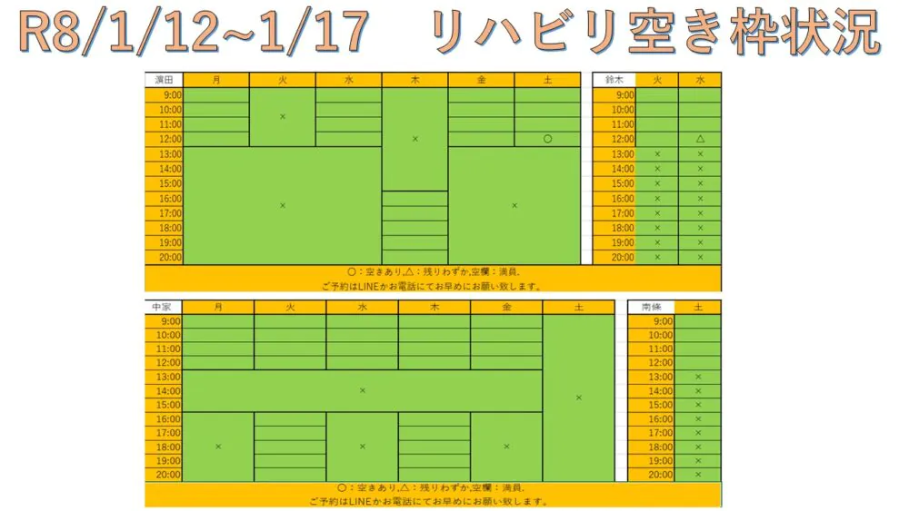 できるだけ多くの方へリハビリを受けて頂けるように、こちらと当院公式LINEにて毎週空き枠情報をお送りしています。