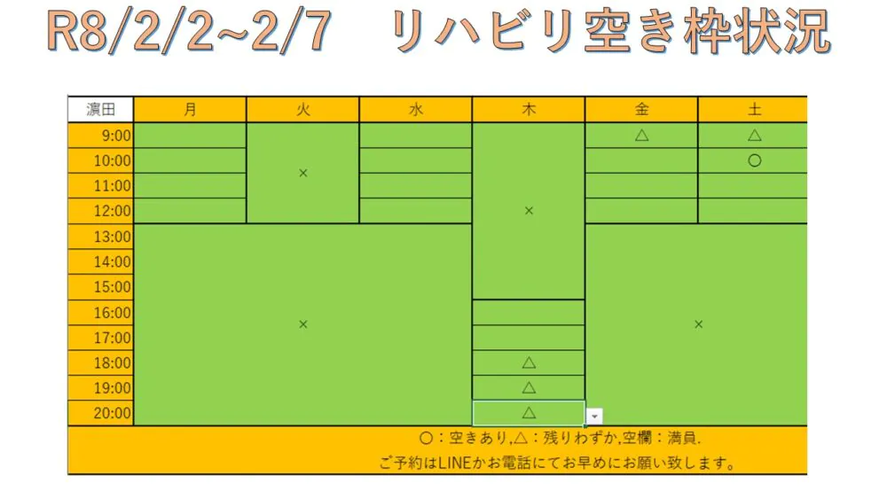 できるだけ多くの方へリハビリを受けて頂けるように、こちらと当院公式LINEにて毎週空き枠情報をお送りしています。
