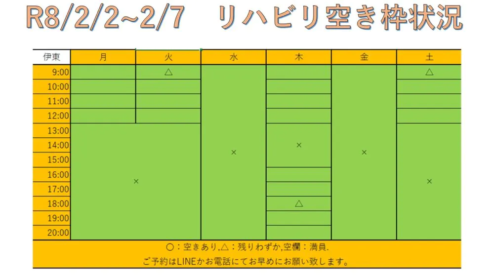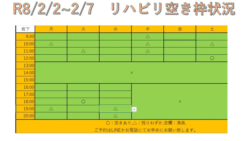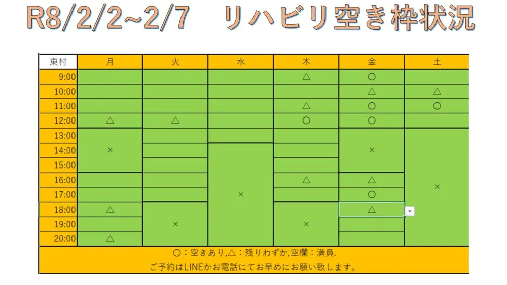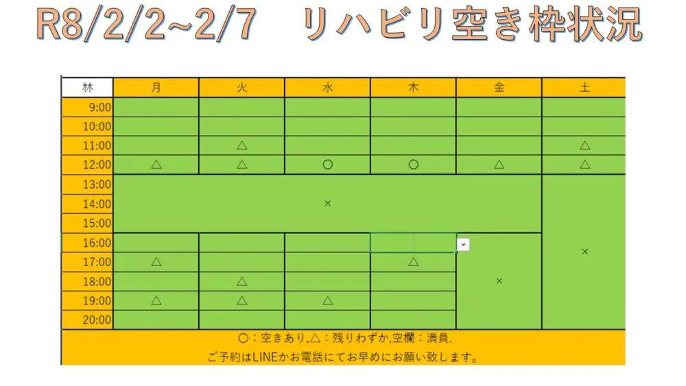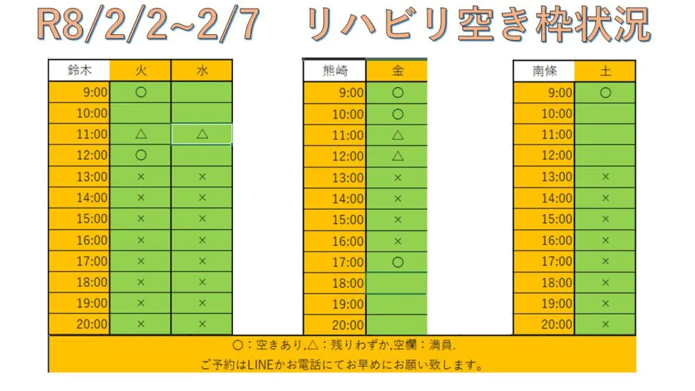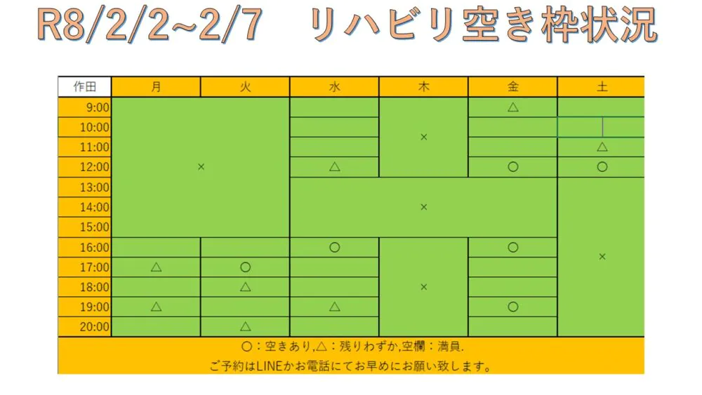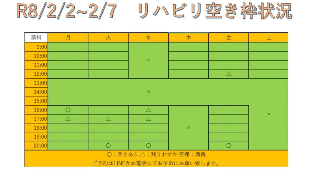 できるだけ多くの方へリハビリを受けて頂けるように、こちらと当院公式LINEにて毎週空き枠情報をお送りしています。