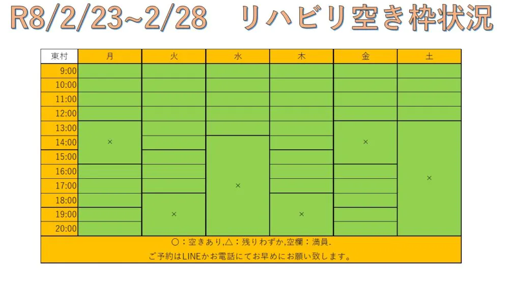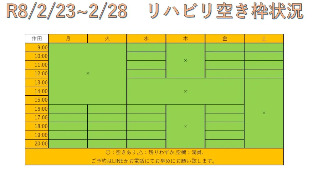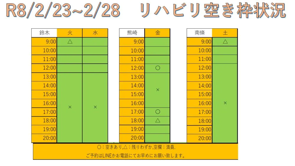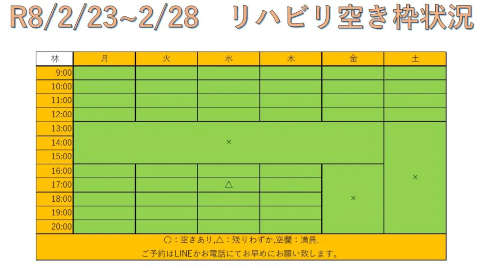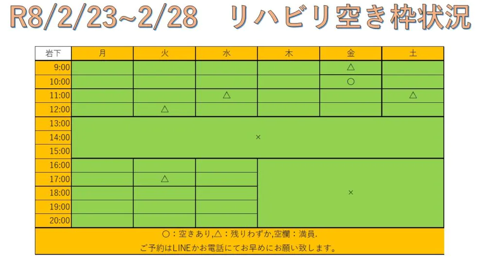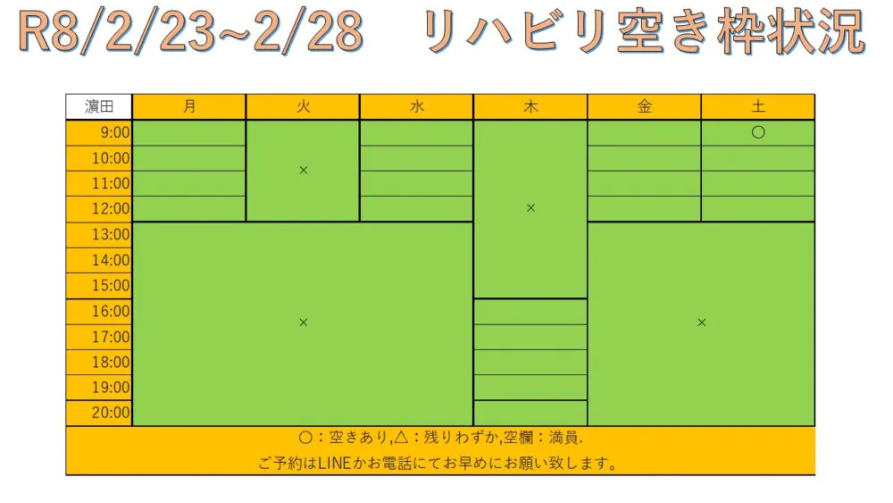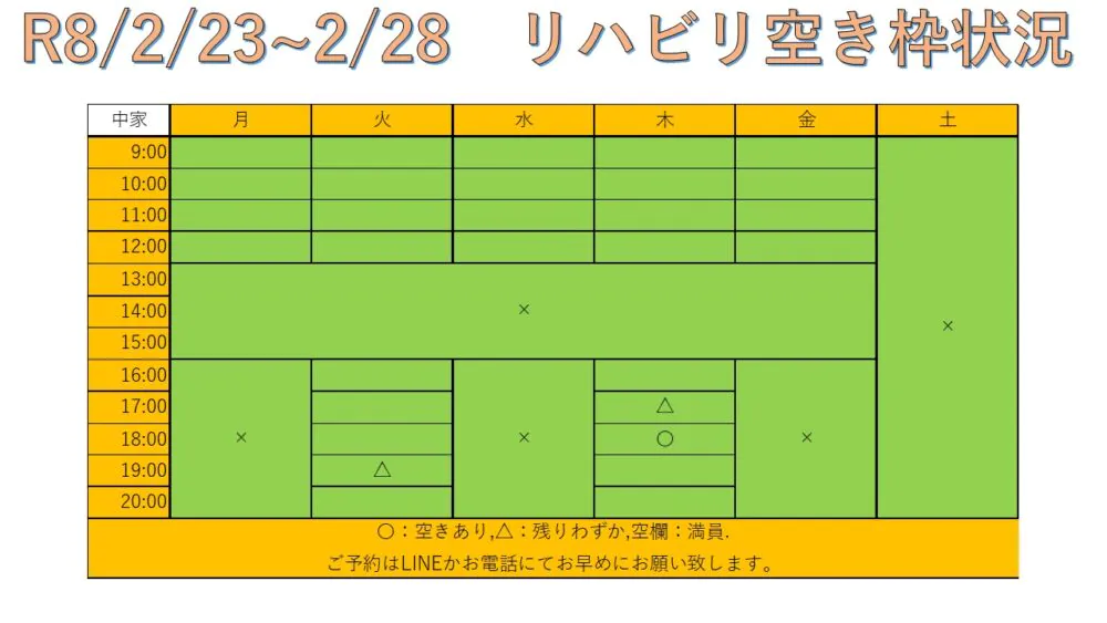 できるだけ多くの方へリハビリを受けて頂けるように、こちらと当院公式LINEにて毎週空き枠情報をお送りしています。